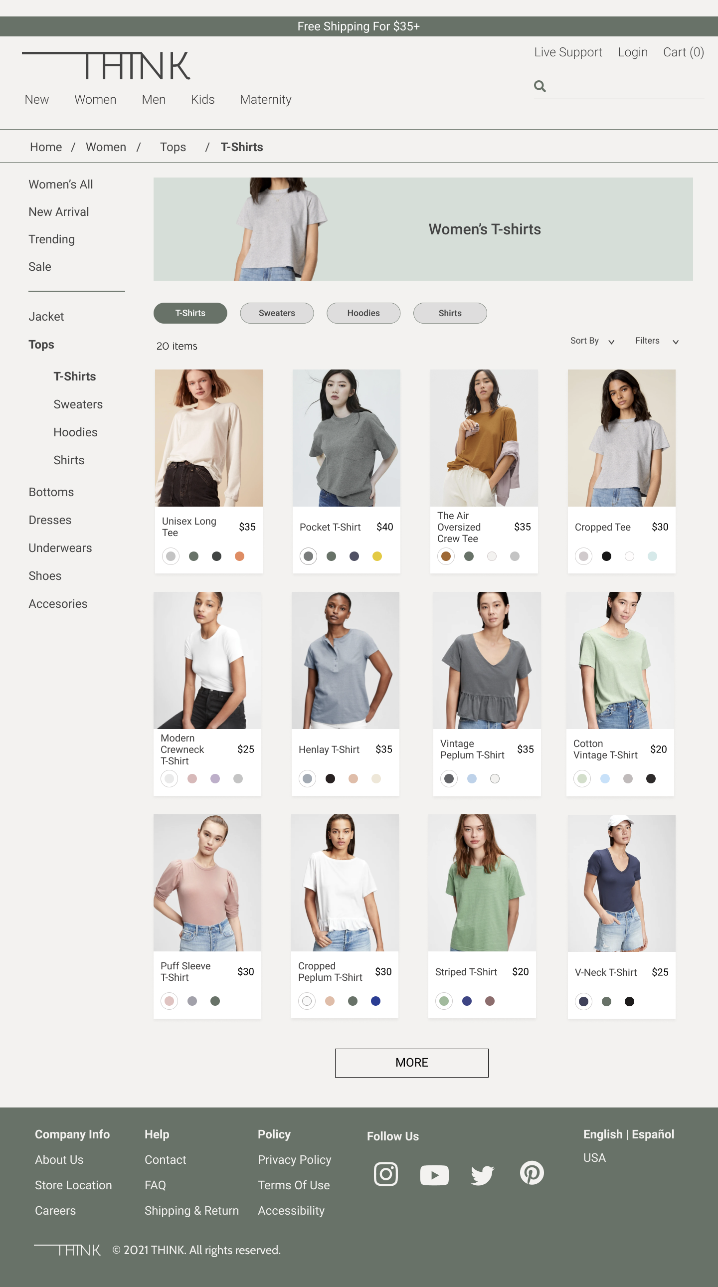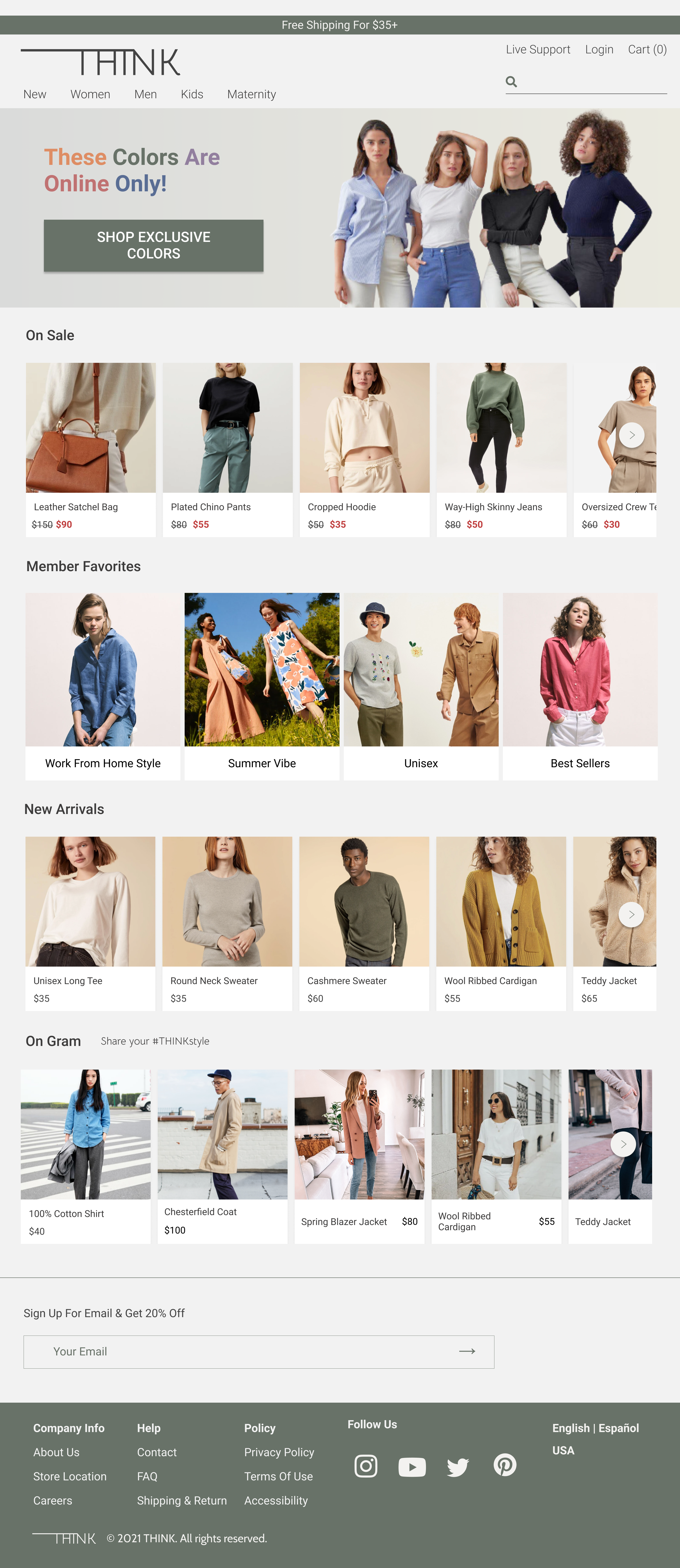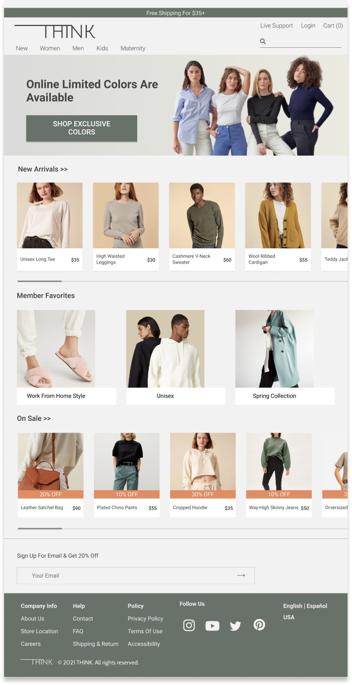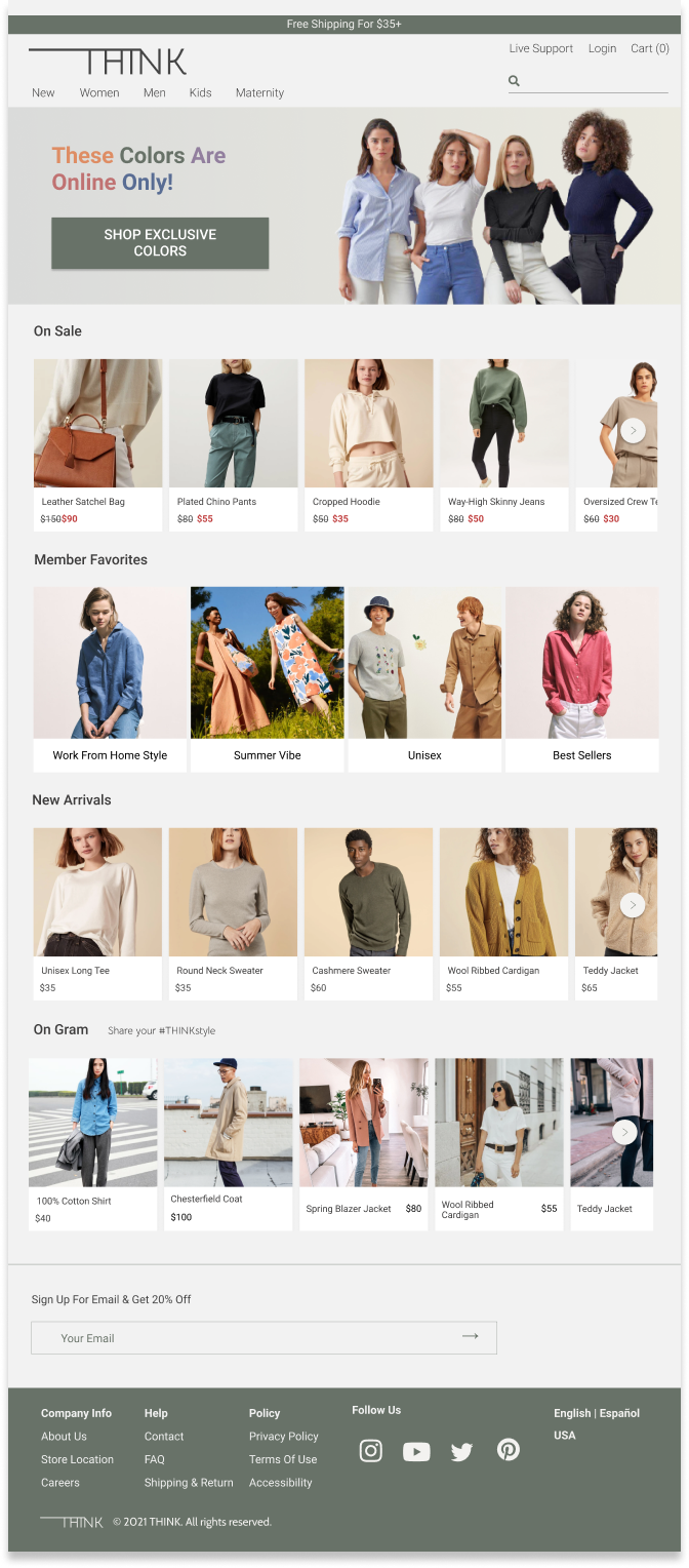 THINK is a successful apparel brand around the world with brick and mortar stores. They decided to launch an online store during the pandemic. I spearheaded end-to-end design for their first e-commerce website.